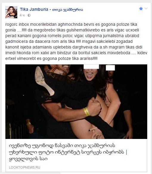 "როგორც inbox-ში მოწერილებიდან აღმოჩნდა ბევრს ეს გოგონა ფოტოზე თიკა ჰგონია ....!!!! და მეგობრებო, თიკას გულშემატკივრებო, ეს არის ვიღაც უცხოელი ფერადკანიანი გოგონა, რომელის ფოტოც ვიღაც უტიფარმა ჟურნალისტმა, უბრალოდ, გადმოიწერა და დააწერა, რომ არის თიკა !!!! მსგავსი საქციელები, ზოგადად, კანონით ისჯება, ადამიანის უფლებების დარღვევაა და ა.შ. მაგრამ თიკას დიდი იმედი ჰქონდა, რომ ხალხი ამ ბინძურ და ბორიტულ საქციელს მიხვდებოდა .... კიდევ ერთხელ ვიმეორებთ, ეს გოგონა ფოტოზე თიკა არ არისს!!!!"